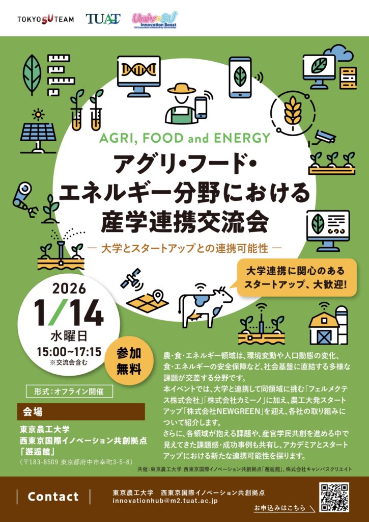 | 主催者 | 共催:東京農工大学西東京国際イノベーション共創拠点・株式会社キャンパスクリエイト |