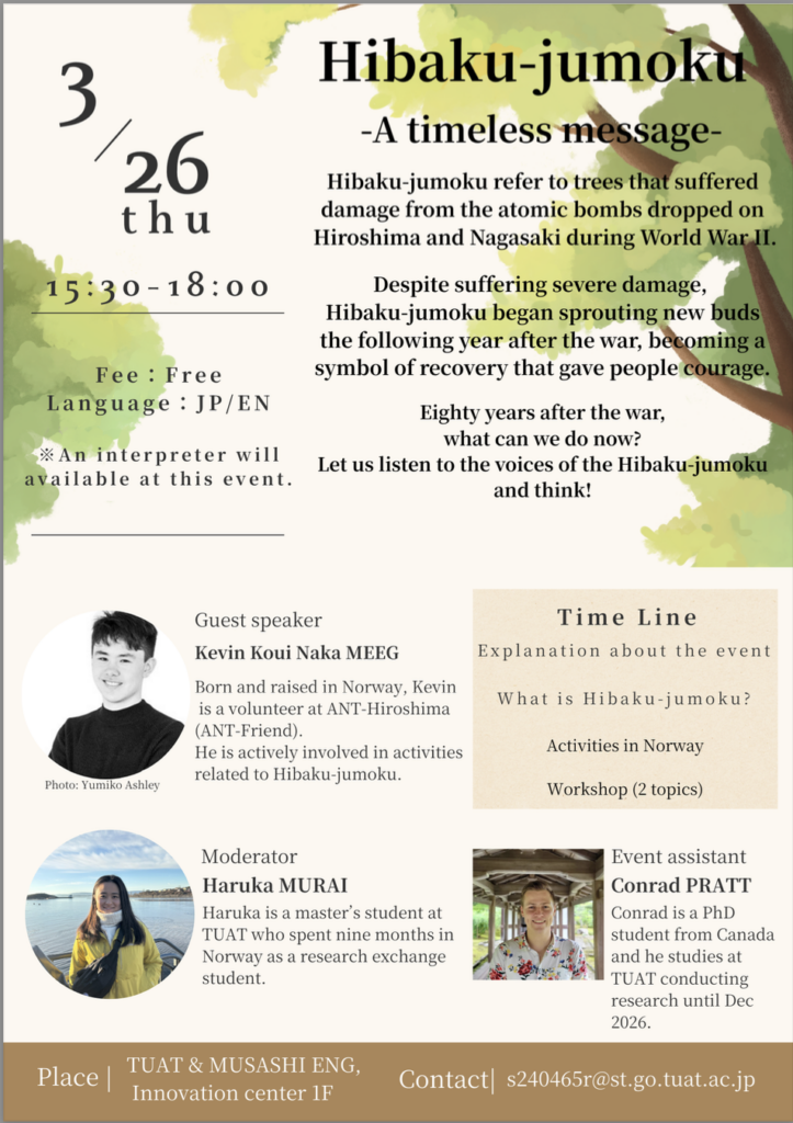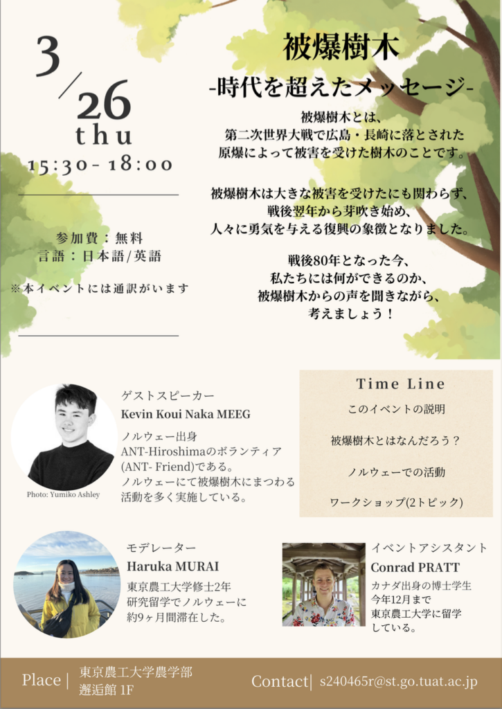 皆さんは「被爆樹木」を知っていますか?被爆樹木とは、1945年に広島・長崎へ投下された原子爆弾の被害を受けながらも生き延びた樹木のことです。復興の象徴として人々に希望を与えてきた彼らは、戦後80年を迎えた今、私たちに何を問いかけているのでしょうか。本イベントでは、ノルウェーで被爆樹木の啓発活動を行う方をゲストスピーカーに招き、国際的な視点から平和と記憶の継承について共に考えます。農学・工学のみならず、国際関係に関心のある方もぜひご参加ください。