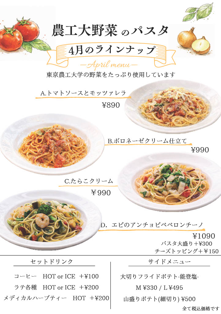 春野菜たっぷりのパスタや、心とからだに染みる美味しいドリンクなどを、ぜひお楽しみください!